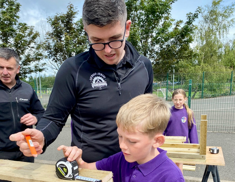 Cutwood Joinery delivered a hands-on community workshop for Shortlees Primary School, Kilmarnock, introducing P5 pupils to the basics of joinery. Led by Oscar and Kris, the session took pupils from safety briefing to measuring, marking out, cutting, fixing and finishing, culminating in three robust timber planters built entirely by the groups.